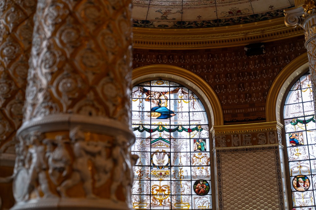 We started the day in the V&A’s cafe, which in and of itself is very much part of the museum’s exhibits. The stunning Victorian architecture, with its gilded facade, stained glass windows, and juxtaposed modern chandeliers, is art in and of itself.