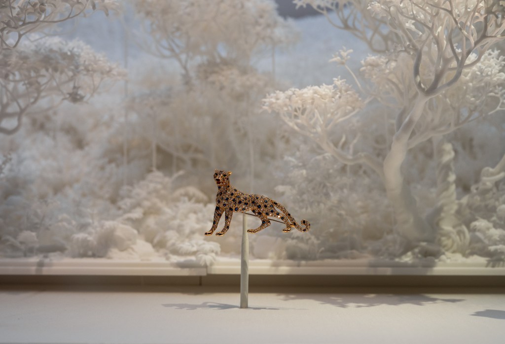But the exhibition highlight for me was a bejeweled golden brooch of a panther displayed against a white forest backdrop. Not only was the pin an exquisite piece of jewelry, but the forest backdrop made it seem like the metal panther was alive, moving among the trees.
